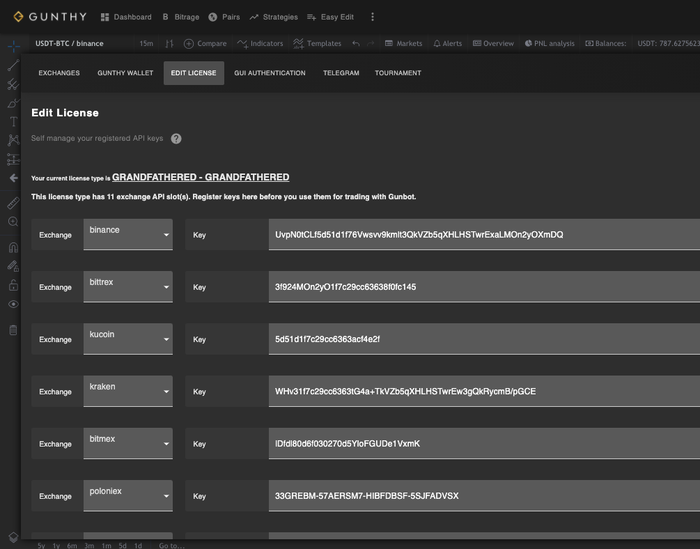 3- Una vez que tengas el tipo de licencia y una API se muestre en el primer slot, puedes elegir en el siguiente slot otro exchange y añadir otra API key. Guardar los cambios. A partir de éste momento, esa Api key será la «MasterKey» de ese exchange. En caso que necesite cambiar una api o exchange, también lo podrá hacer desde esta misma sección.