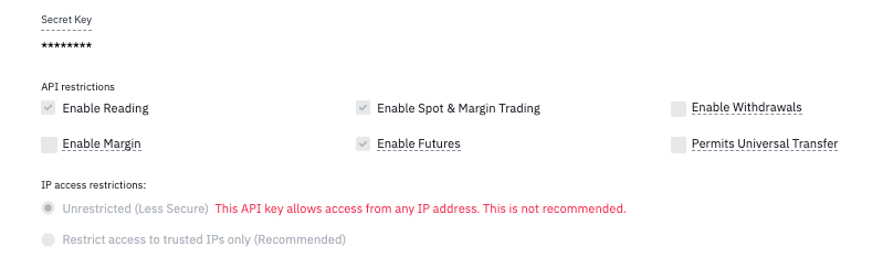 3- En el caso de que los pasos 1 y 2 no hayan solucionado el error, cambia tu api key por una nueva y asegúrate de que el api tiene los permisos correctos puestos. Si tienes el bot funcionando en los futuros de Binance, los permisos del api deben ser como los que ves a continuación: